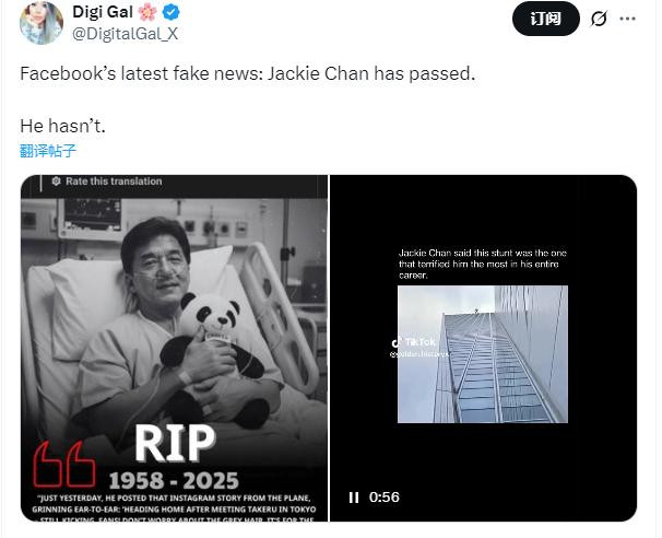 该帖子配以一张人工智能生成的成龙躺在病床上的图片,并附有捏造的日期星速优配平台,暗示他已经去世,帖子迅速走红。